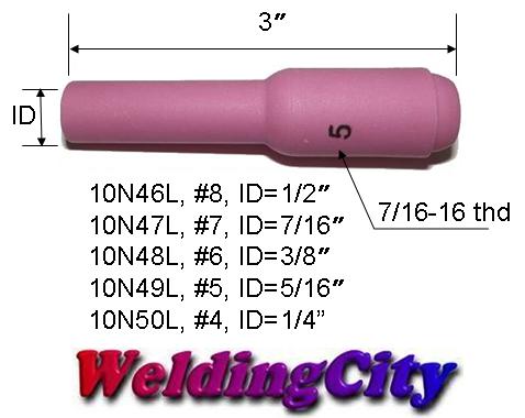 • Long alumina nozzle 10N49L #5 for use with 17, 18 and 26 TIG torches.