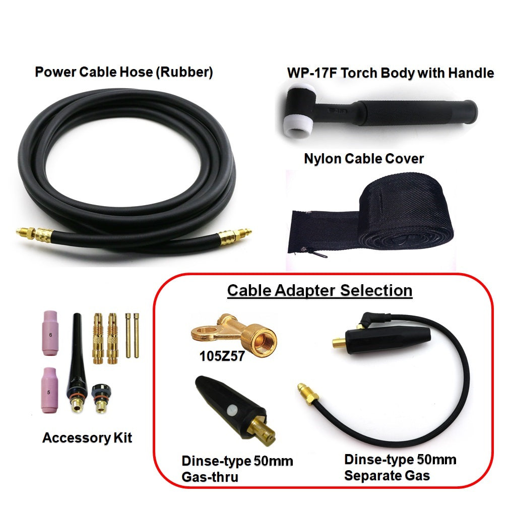 • Package includes rubber power cable hose, torch head body, accessory kit (cups, collets and collet bodies), Nylon® cable cover and selectable cable adapters. Simple on-site assembly needed.