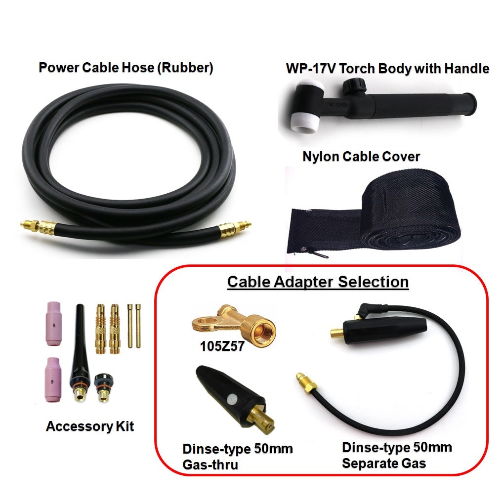 • Package includes rubber power cable hose, torch head body, accessory kit (cups, collets and collet bodies), Nylon® cable cover and selectable cable adapters. Simple on-site assembly needed.