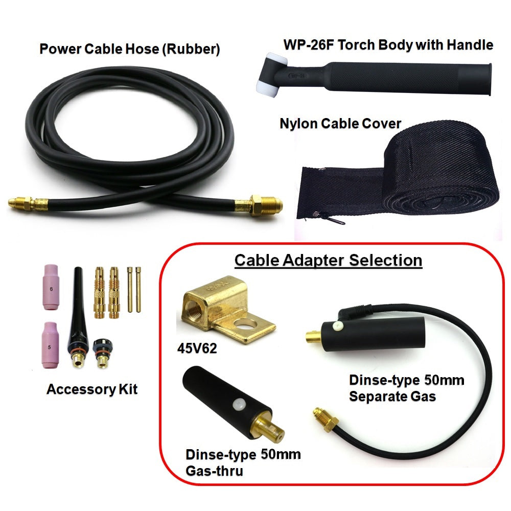 • Package includes rubber power cable hose, torch head body, accessory kit (cups, collets and collet bodies), Nylon® cable cover and selectable cable adapters. Simple on-site assembly needed.