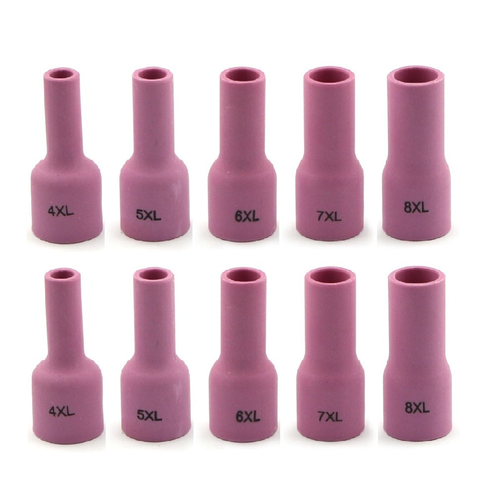 • 10-pcs assorted orifice sizes (#4-#8) extra-long 53N-XL series gas lens Alumina ceramic cups for 9, 20 and 25 series TIG welding torches.