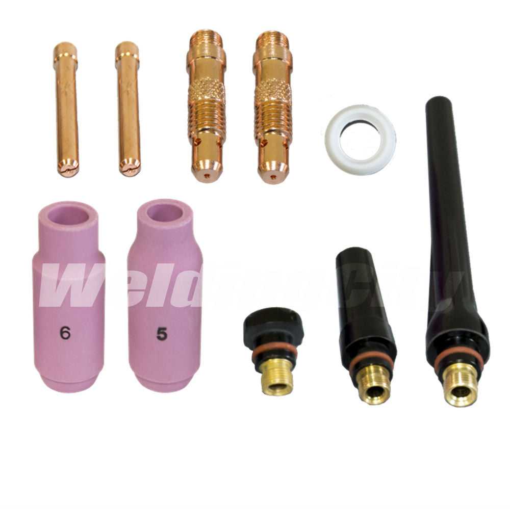 • Accessory kit contains torch consumables 10N-series collets and collet bodies (.040", 1/16", 3/32" and 1/8"), 10N-series regular-length and 10NL-series long Alumina ceramic cups (#4, #5, #6, #7 and #8), 57Y-series torch back caps (long, medium and short) and Teflon torch gasket 18CG.