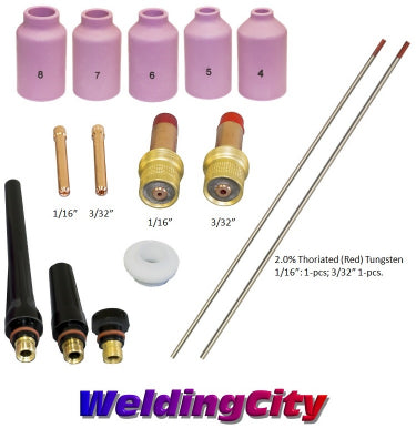 WeldingCity® 15-pcs TIG Torch Accessory Kit Assorted 1-16-3-32 with 2.0% Thoriated (Red) Tungsten Electrodes