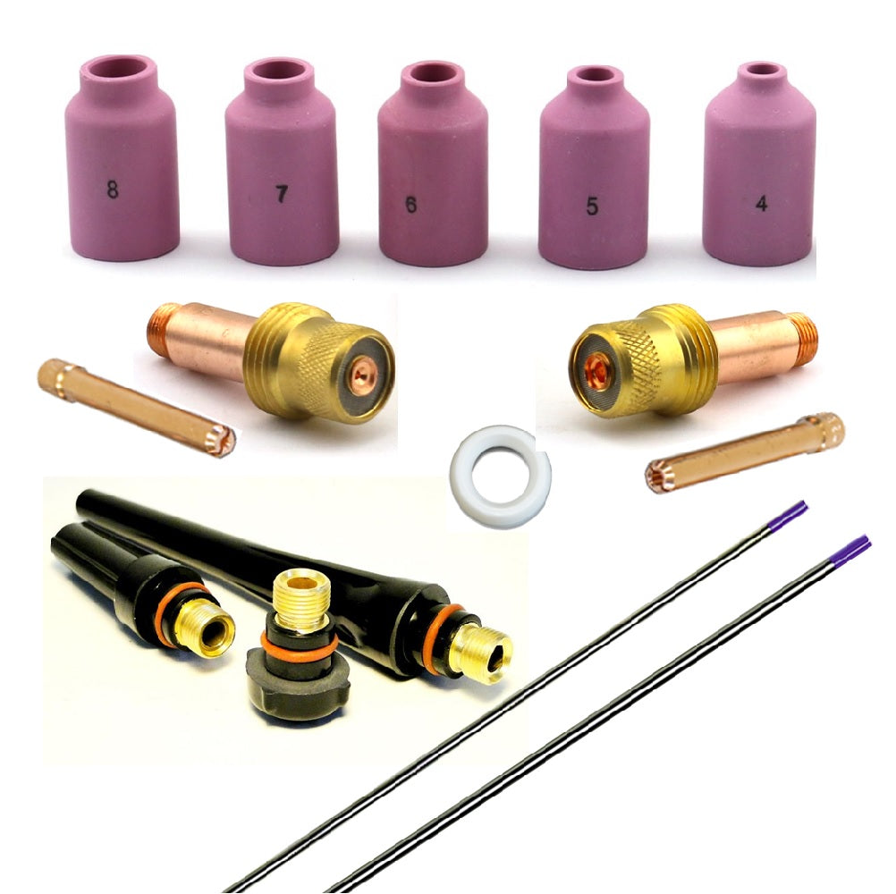 • Parts included: Collets, Gas Lens, Ceramic Cups, Back Caps, Gasket and Tungsten Electrodes.