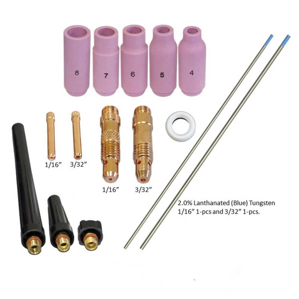 • 15-pcs kit; includes assorted-sizes collets, collet bodies, Alumina ceramic cups, gasket, back caps and Tungsten electrodes. See table below for content.