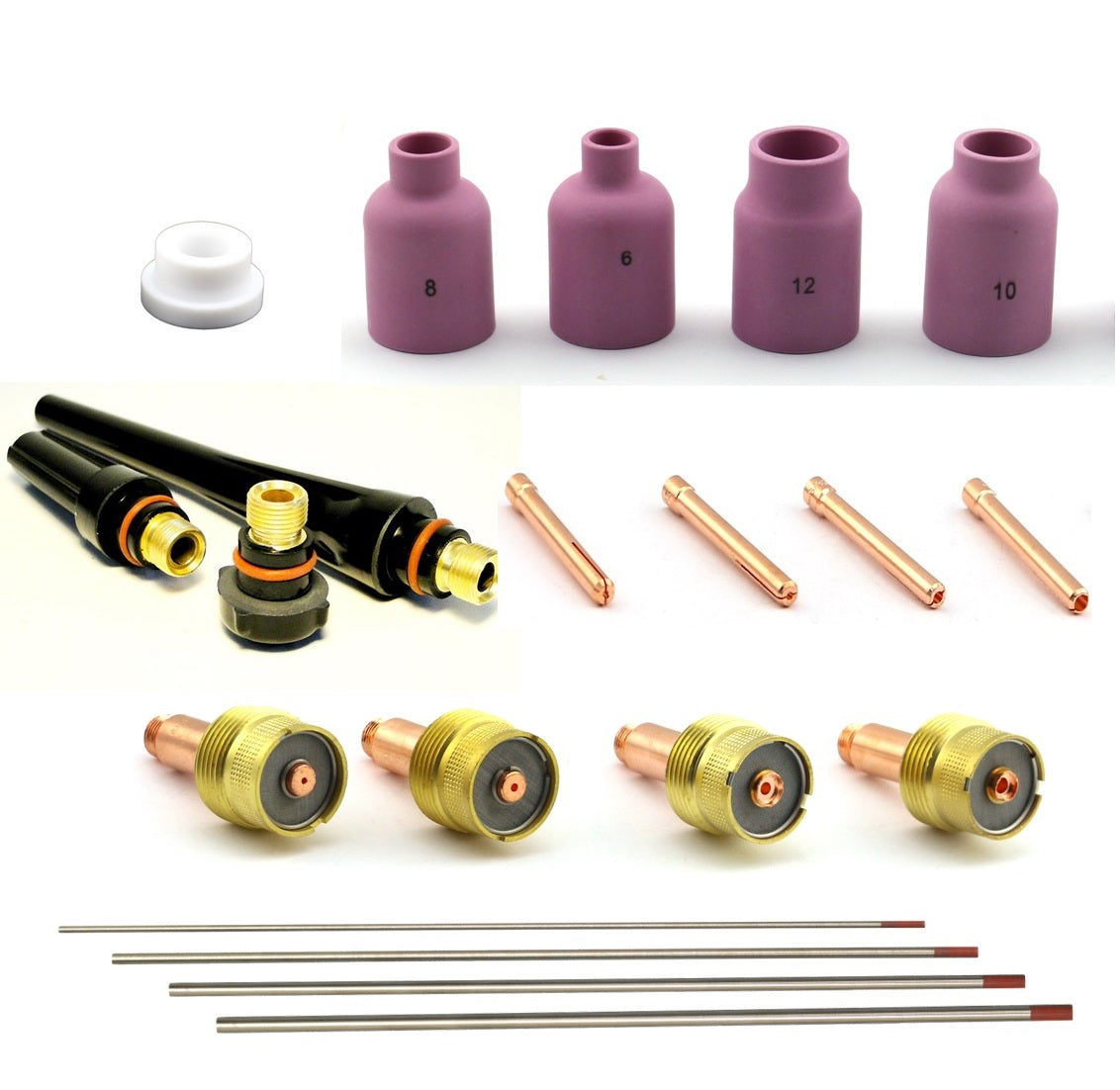 • 20-pcs kit; includes assorted-sizes collets, large gas lens collet bodies, Alumina ceramic cups, gasket, back caps and Tungsten electrodes. See table below for content.