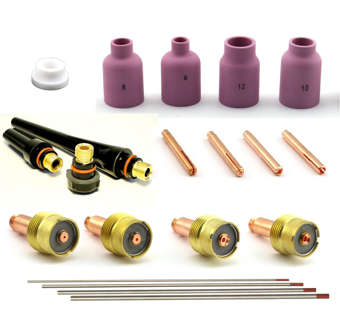 • 20-pcs kit; includes assorted-sizes collets, large gas lens collet bodies, Alumina ceramic cups, gasket, back caps and Tungsten electrodes. See table below for content.