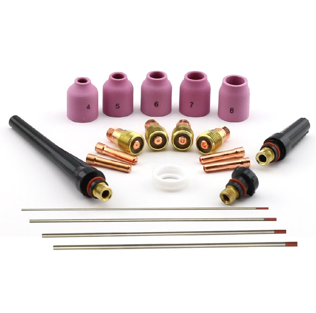 • 21-pcs kit; includes assorted-sizes collets, gas lens collet bodies, Alumina ceramic cups, gasket, back caps and Tungsten electrodes. See table below for content.