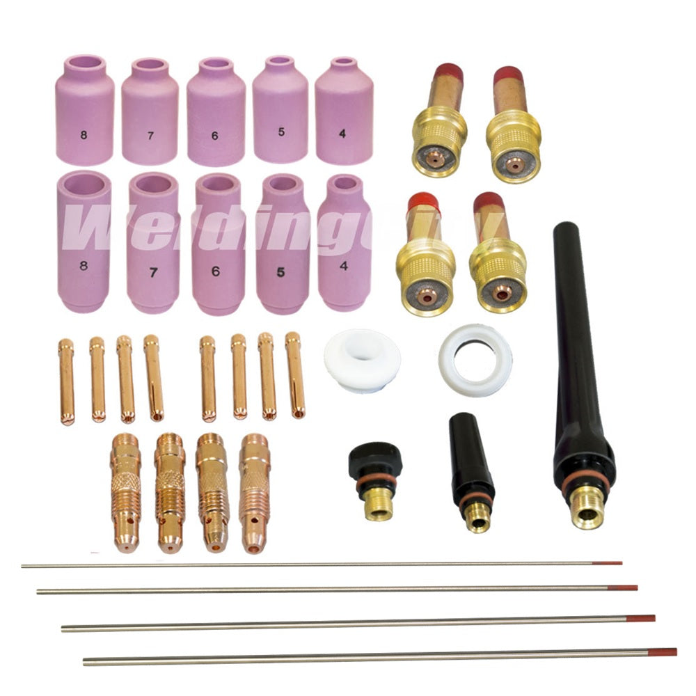 • 35-pcs kit; includes assorted-sizes collets, regular and gas lens collet bodies, Alumina ceramic cups, gasket, back caps and Tungsten electrodes. See table below for content.