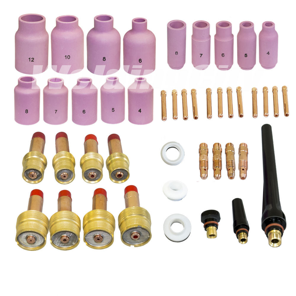 • 44-pcs kit; includes assorted-sizes collets, collet bodies, gas lens collet bodies, Alumina ceramic cups, gasket, back caps. See table below for content.