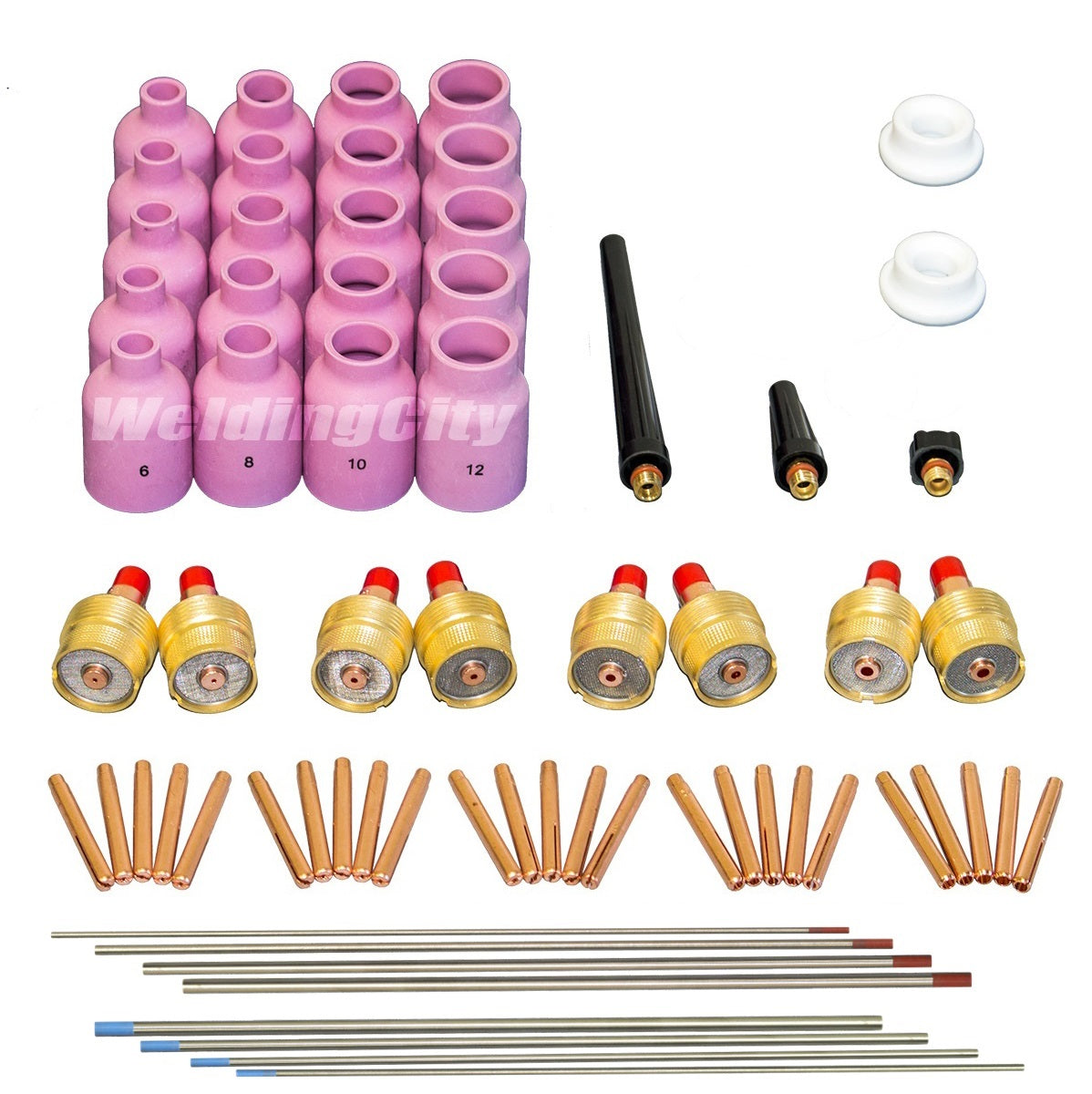 • 66-pcs kit; includes assorted-sizes collets, large gas lens collet bodies, Alumina ceramic cups (large gas lens), gasket, back caps and Tungsten electrodes. See table below for content.