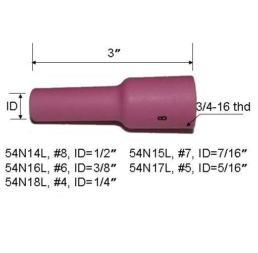 • Long 54NL series gas lens Alumina ceramic cups for 17, 18 and 26 series TIG welding torches.