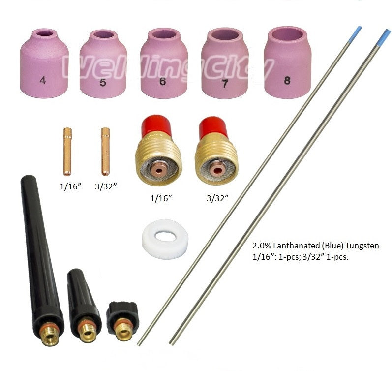 WeldingCity® Torch Accessory Kit 15-pcs 1-16-3-32 with 2.0% Lanthanated Tungsten Electrodes for Gas Lens Setup