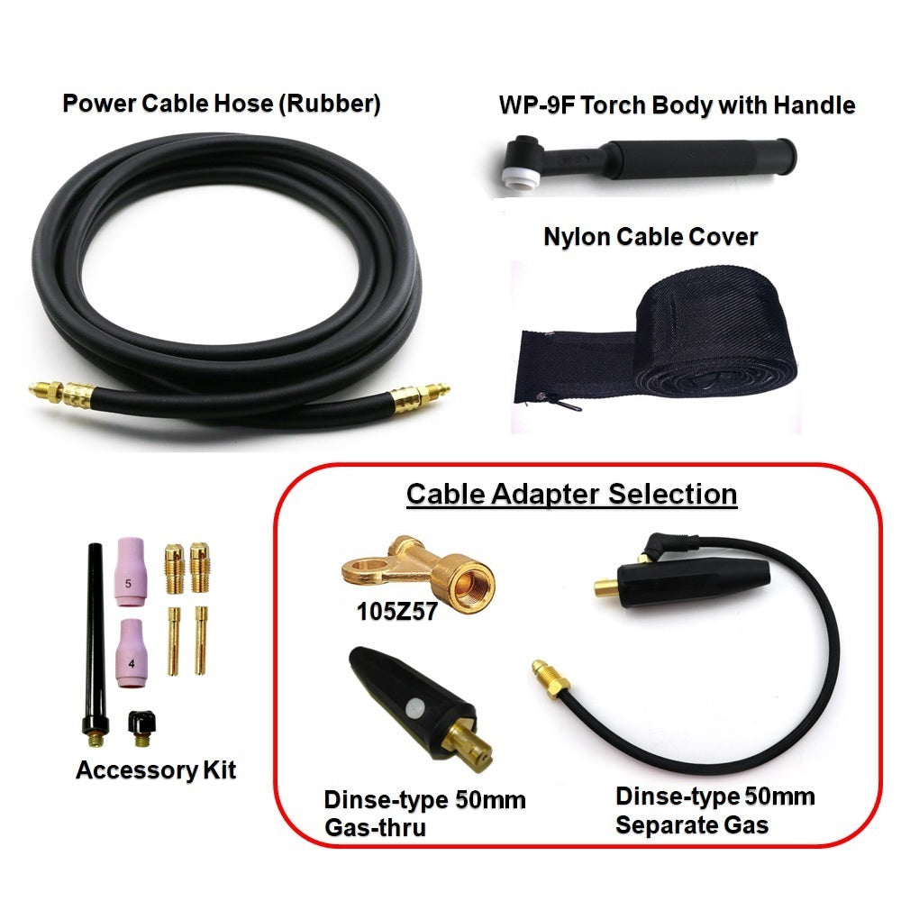 • Package includes rubber power cable hose, torch head body, accessory kit (cups, collets and collet bodies), Nylon® cable cover and selectable cable adapters. Simple on-site assembly needed.